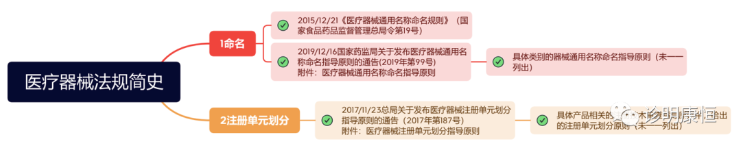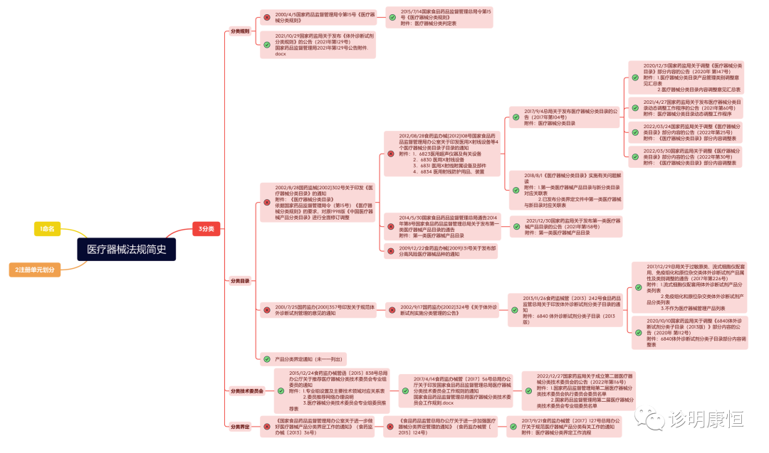 发表时间:2023-02-08 10:23 医疗器械行业的小伙伴,在刚刚踏入医疗器械领域时可能会感到迷茫,查阅法规时无法分辨网络上的海量信息,或者筛选适用的法规依据时拿不定主意。 行业发展以来,为了规范管理,国家药品监督管理局出台了一系列的法律法规和工作文件,为了更加方便、有条理地学习和熟练掌握它们,诊明康恒的小编从最关键的信息入手,认真查阅和梳理了药监局官网的医疗器械法规文件,对它们进行了分门别类地归纳整理,用一张张思维导图向大家娓娓道来…… 命名、注册单元划分与分类 图中内容只关注官方发布,未添加多余的文字。用最简单客观的方式呈现,保留了最重要的信息:日期、文号和名称,同时标注了是否失效(其中红色×代表失效,绿色√代表有效)。 01 命名、注册单元划分